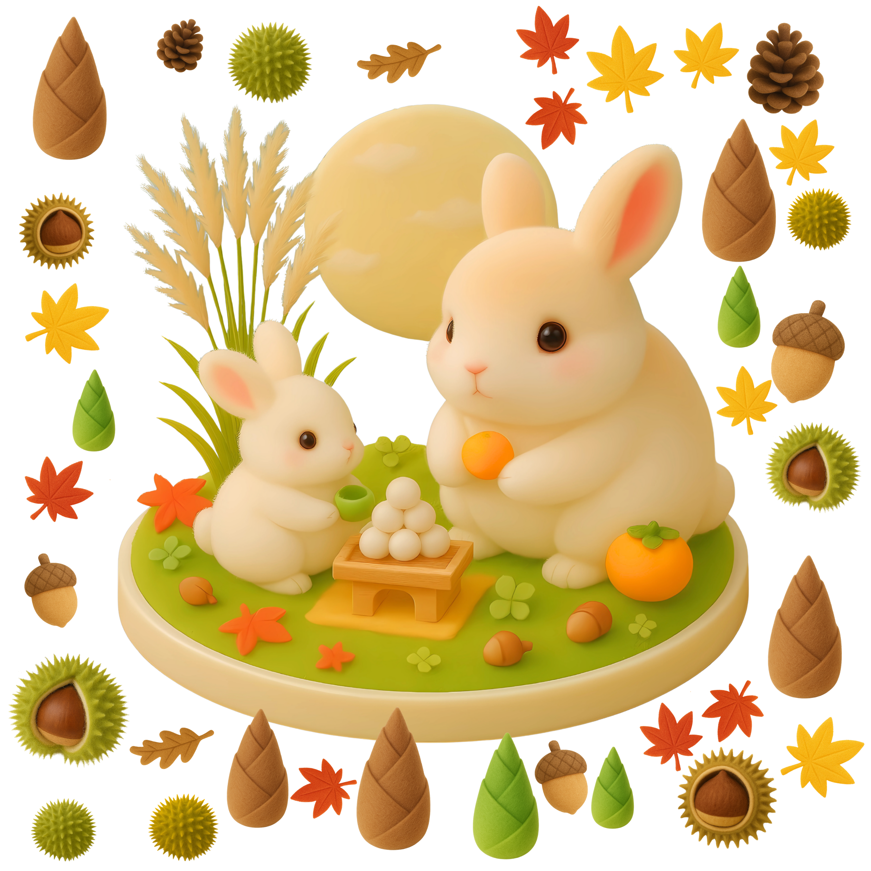 秋らしい落ち葉やどんぐりに囲まれた、可愛いウサギのイラスト入りアクリルキーホルダーです。